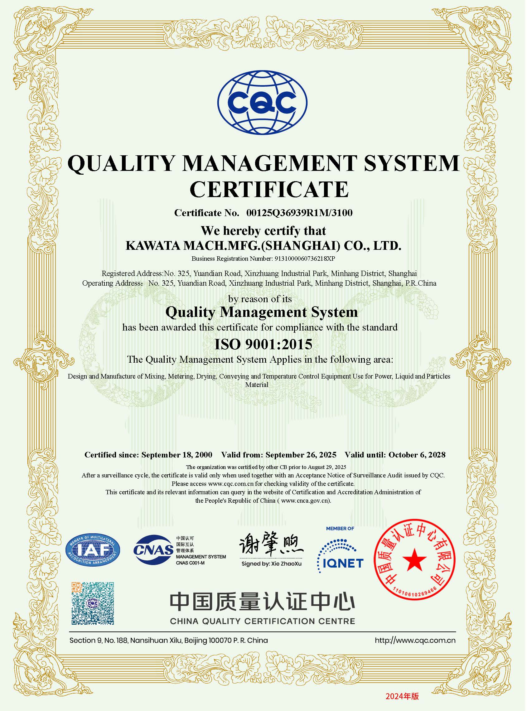 ISO9001証書(2025.9.26-2028.10.6)